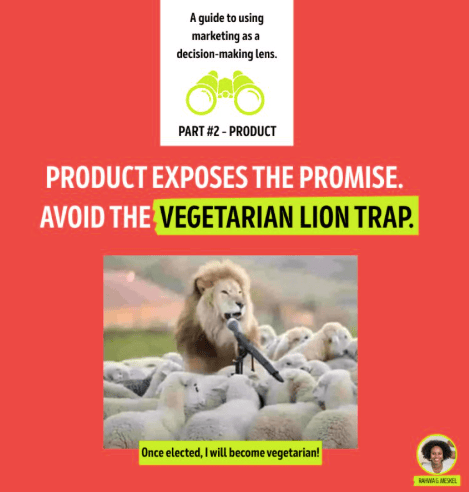 This is another path into the Vegetarian Lion Trap. When the product is sending one message and the marketing sends another, audiences don’t believe the story — they believe the experience.